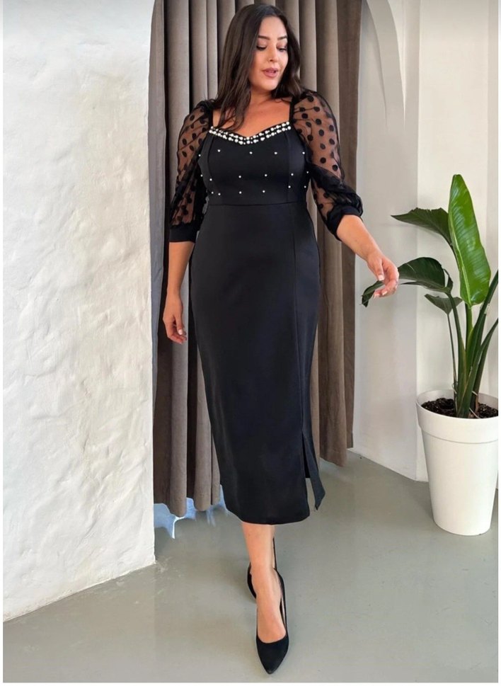 İnci Detaylı Tül Kollu Siyah Uzun Elbise