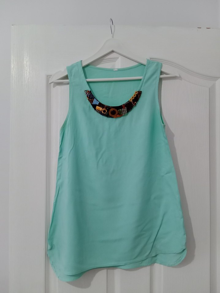 Turkuaz renkli, kolsuz ve yuvarlak yakalı bluz, boncuk detaylıdır. Rahat kesim ve midi boyda, yumuşak dokulu kumaştan üretilmiştir. Günlük sokak stiline uygundur.