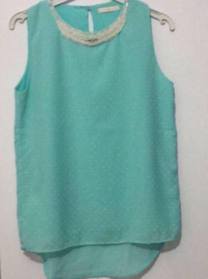 İnci Detaylı Turkuaz Kolsuz Bluz