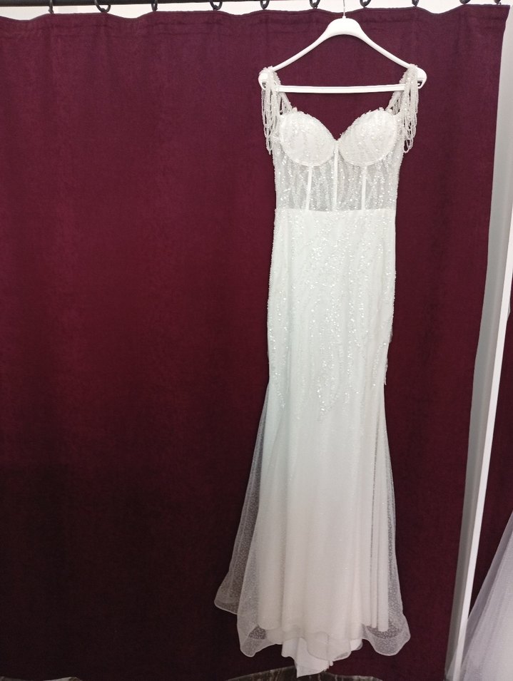 İnci detaylı, askısız ve kolsuz balık kesim uzun gelinlik, modern klasik şıklığı yansıtır.