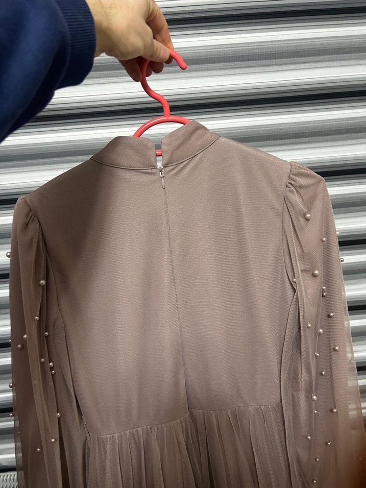 İnci Detaylı Uzun Bej Elbise
