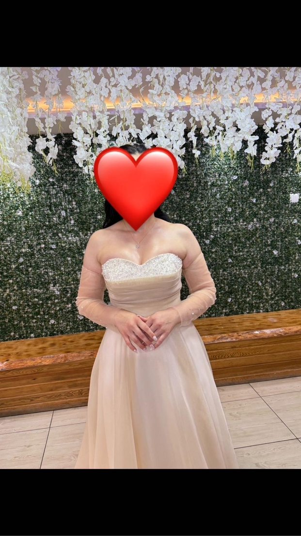 Uzun kollu, straplez ve incili yakalı, bej renkli, modern klasik tarzda fit kesim nişan elbisesi. Düğünler için uygundur.