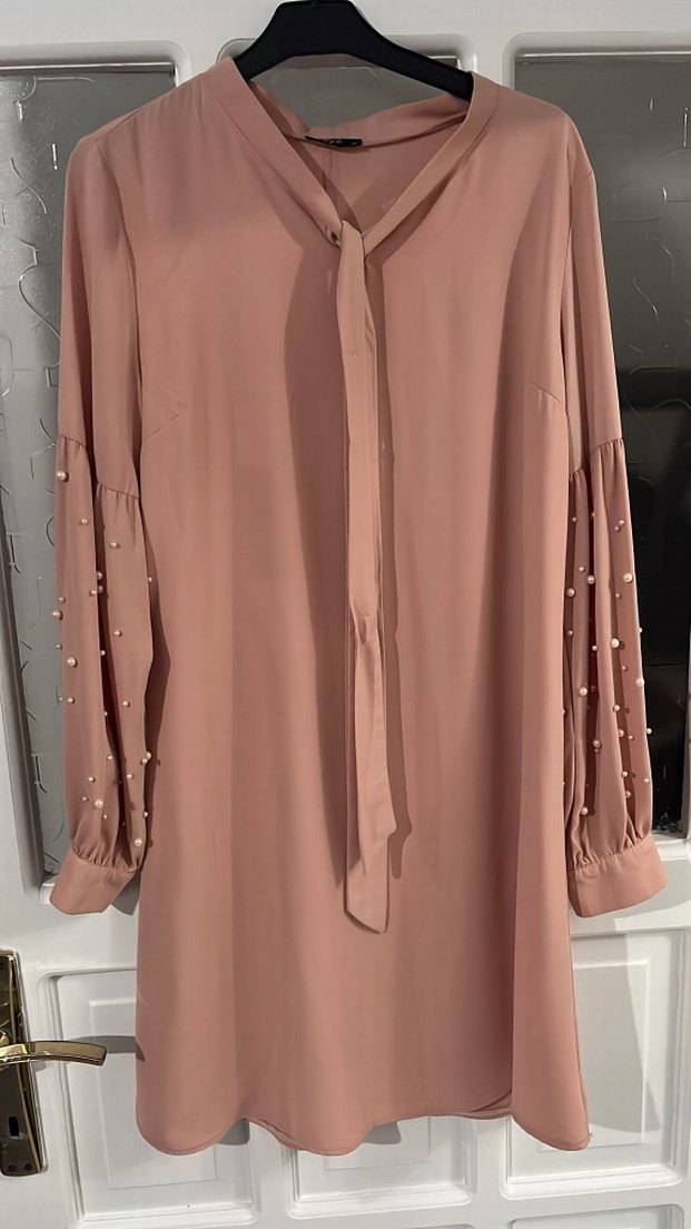 İnci detaylı, uzun kollu ve V yakalı bej tunik. Parlak, ipeksi kumaştan üretilmiş, rahat kesimli ve ofis kullanımı için uygundur. ✨