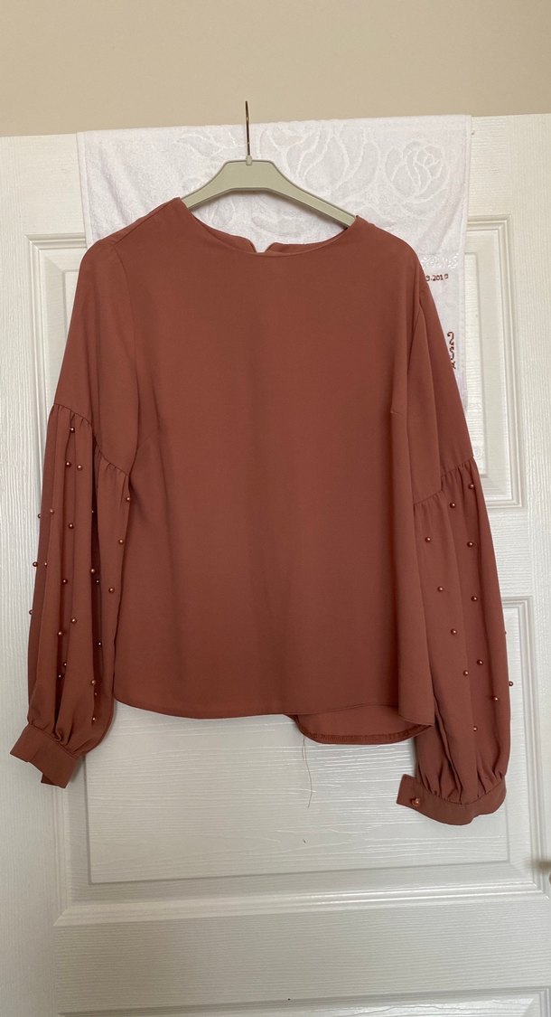 Bej renkli, inci detaylı uzun kollu bluz. Düğmeli manşetleri ve bol kesimiyle rahat kullanım sağlar. Günlük kullanıma uygundur..çy