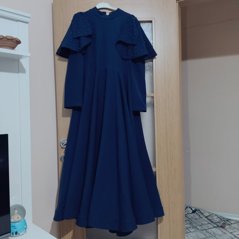 Uzun kollu ve yuvarlak yakalı mavi abiye elbise, omuzlarda inci detaylarıyla zarif bir görünüm sunar. Dökümlü ve sade tasarımıyla düğün için uygundur.