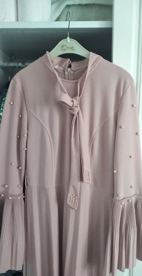 pudra renkte, uzun kollu, yakalı ve kol detaylarında pileli uzun elbise. İnci süslemeleri ile klasik şıklık sunar. Yumuşak sentetik kumaştan, normal kesim.