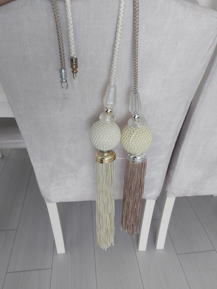İnci işlemeli uzun perde bağları, beyaz ve gri tonlarda püsküllü detaylara sahiptir. Salaş kesimdir ve perdelere şıklık katar. tanesi 100 almak istediginiz rengi belirtin