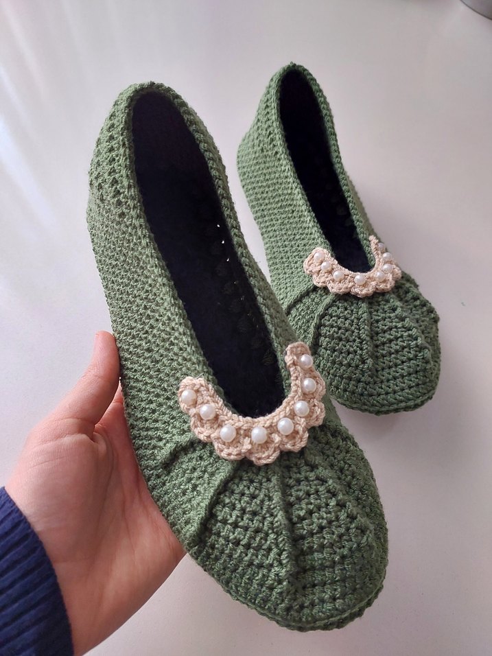 Bu yeşil örgü terlikler, stiletto topuk ve inci detaylarıyla günlük kullanıma uygun, rahat ve klasik bir stile sahiptir.