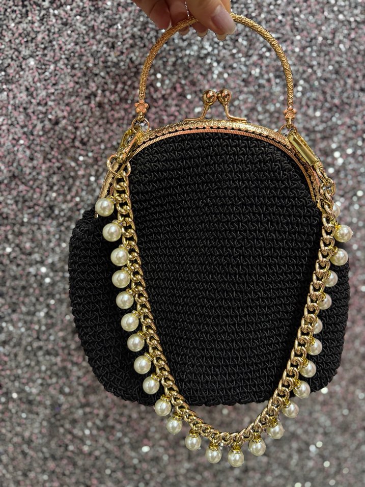 İnci Detaylı Zincir Askılı Siyah Örgü Çanta