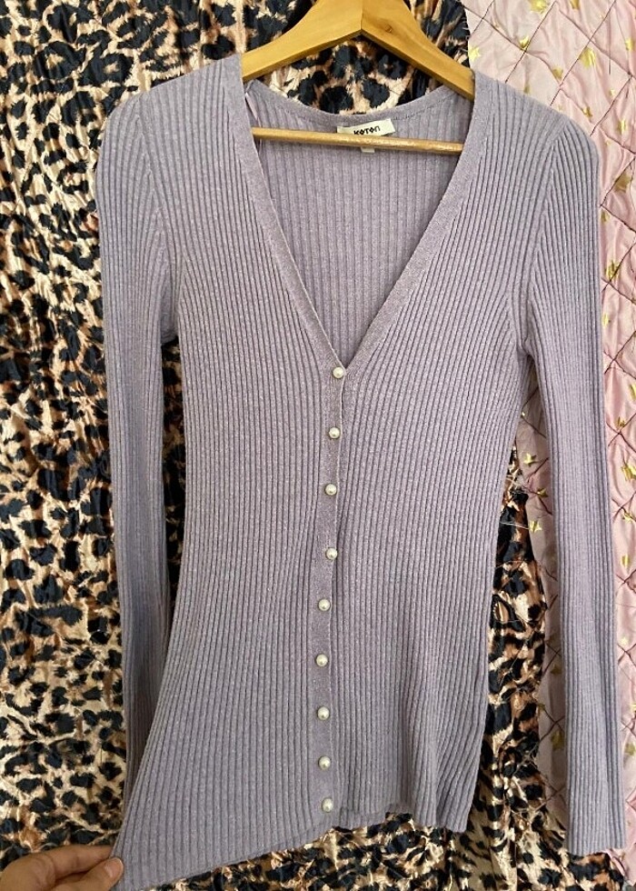 İnci düğmeli lila hırka