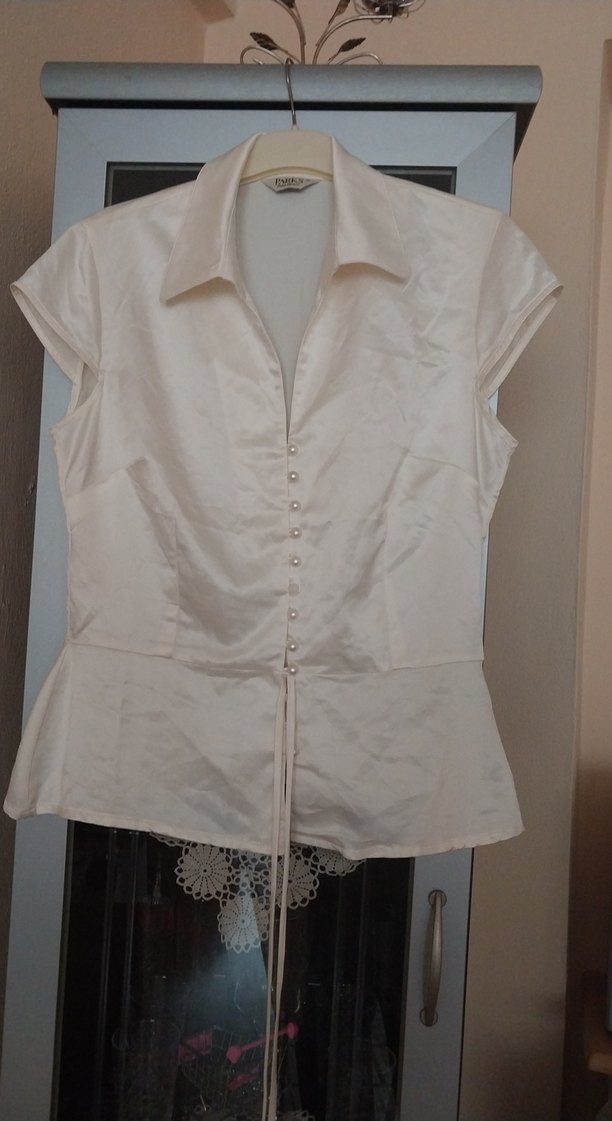 inci düymeli kolsuz ve yakalı kadın gömlek, saten kumaştan üretilmiştir. ekru renkte, ve ofis ile günlük kullanıma uygundur. ✨iki kol arası 103 boy 53 cm