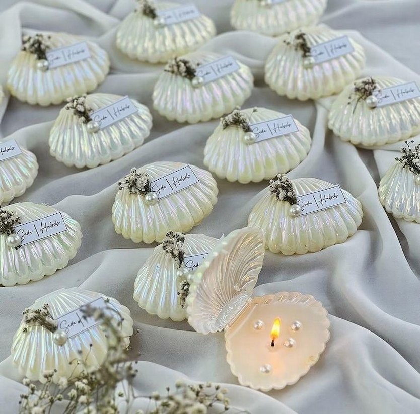 İnci ve çiçek detaylı beyaz deniz kabuğu şeklinde mumluklar, içinde yumuşak ışık veren mum bulunur. Zarif dekorasyon için uygun 50 adet