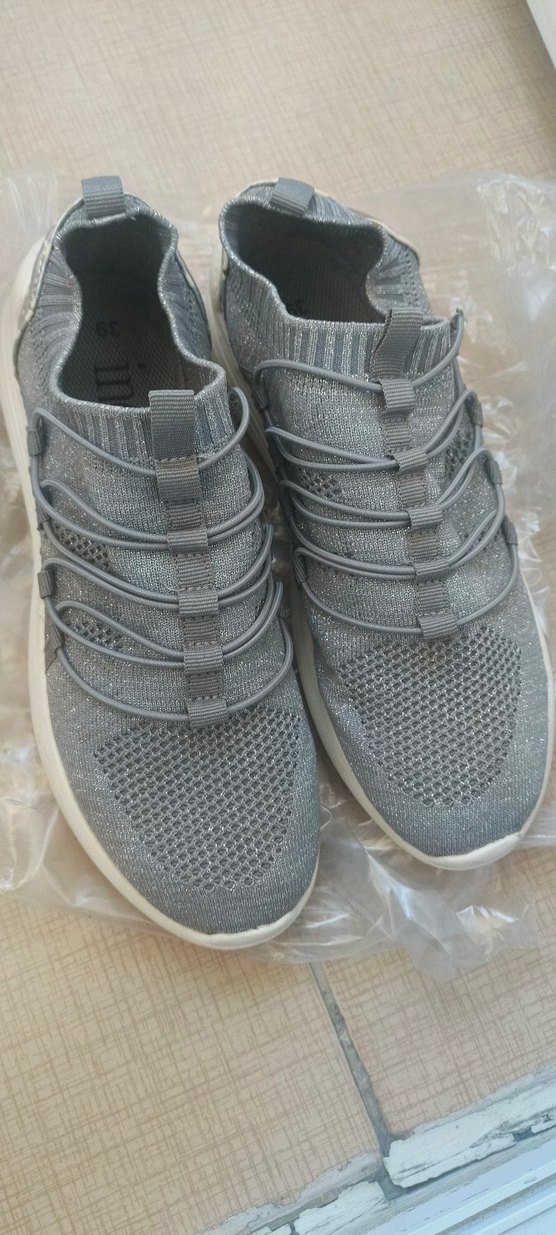 Gri kadın spor ayakkabı, esnek detaylar ve eskitme topuklu tasarıma sahip, nefes alabilir örme üst yüzey ve kauçuk taban ile sokak stili için uygun.