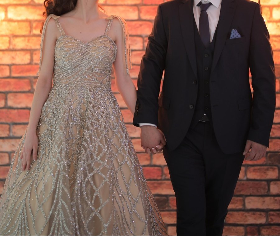 İnci İşlemeli Altın Renk Uzun Abiye Elbise