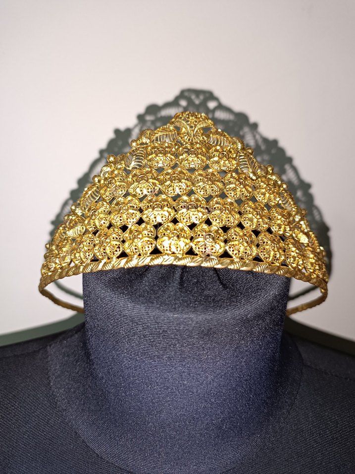 Parlak altın renkli, inci işlemeli kadın örgü Taç geleneksel tarzı avangart bir duruşla birleştirir.✨