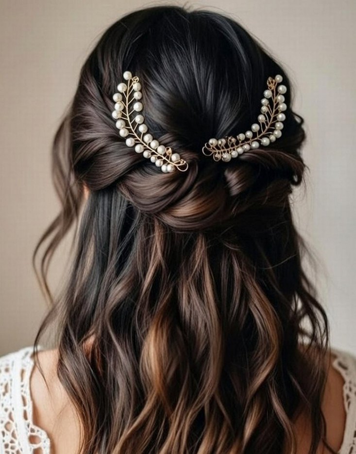 gelin tokası İnci işlemeli, parlak bej renkte, ipeksi dokulu, bohem tarzda klasik zarafet için çift saç tokası.