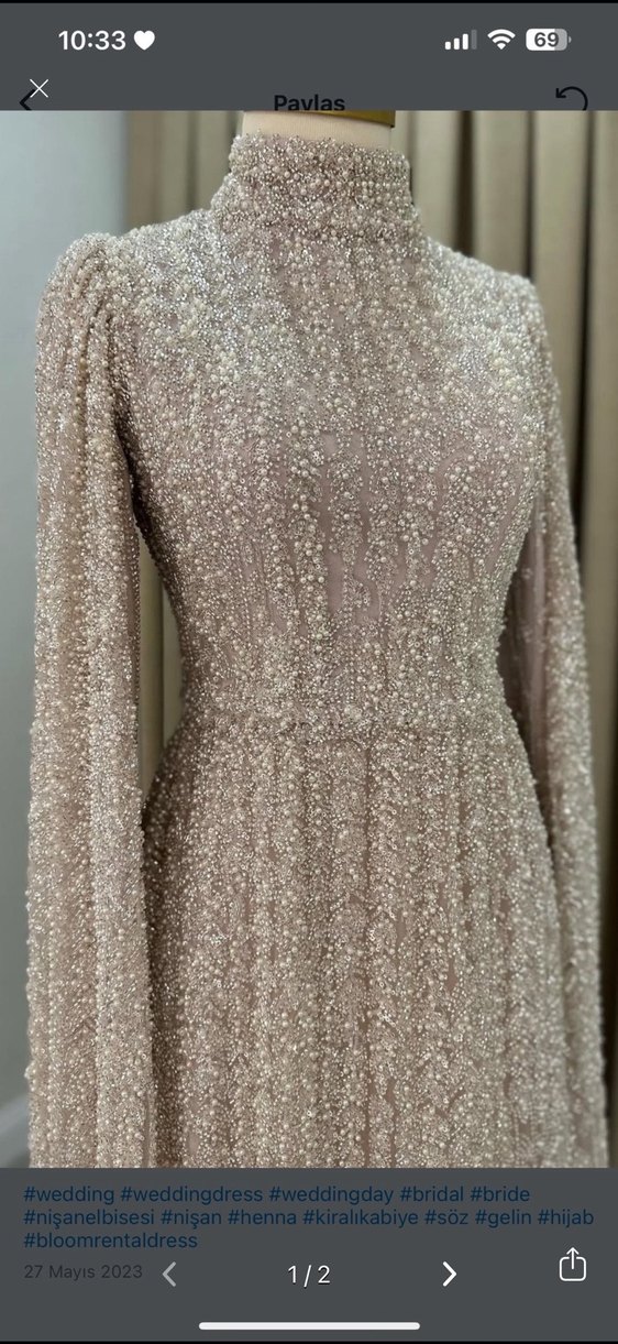 Yüksek yakalı ve uzun kollu, inci işlemeli bej uzun abiye elbise. Parlak ve zarif görünüm sunan modern klasik tarzda, düğünler için uygun.Fiyatta yardımcı olunur