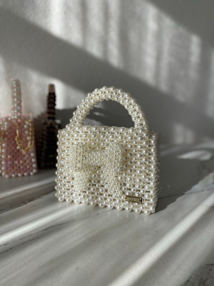 İnci işlemeli ve nakışlı desenlere sahip beyaz boncuklu kadın çantası. Plastik malzemeden yapılmış, bohem ve Parisli avant-garde tarzını yansıtır.