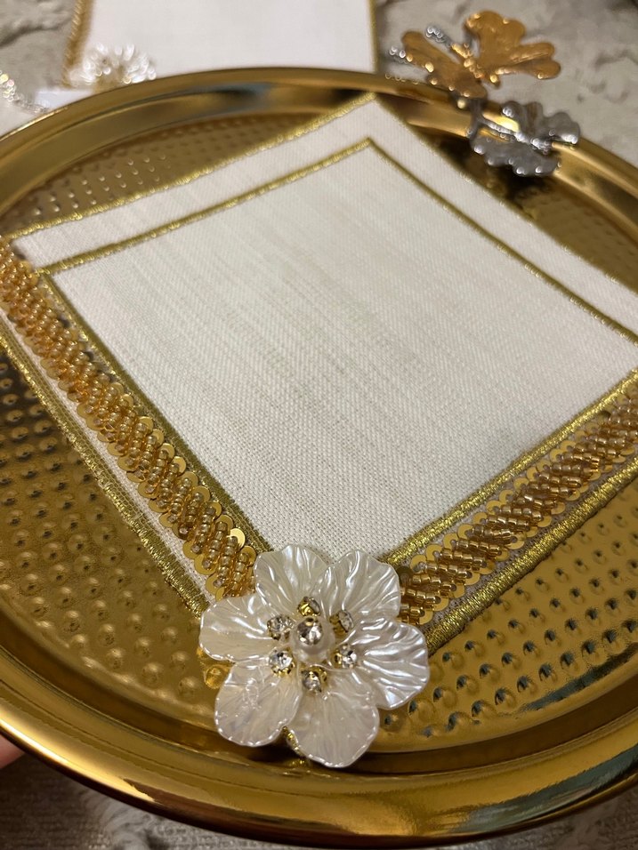 İnci işlemeli beyaz düğün peçetesi, parlak altın bordür ve çiçek detaylarıyla modern klasik Paris şıklığını yansıtıyor.