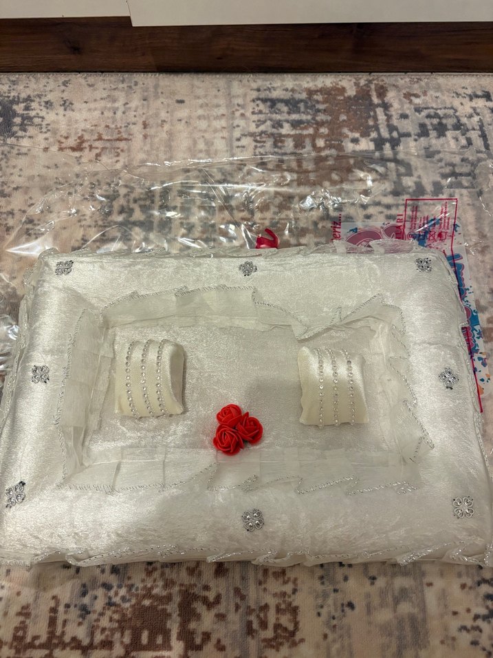 İnci işlemeli, dantel detaylı beyaz düğün tepsisi, yumuşak dokulu ve sade tasarımlı. Kırmızı güllerle süslenmiştir.