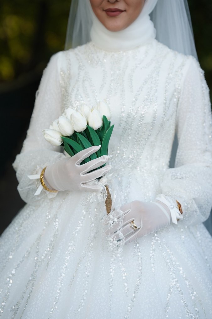 İnci işlemeli, uzun kollu ve yüksek yakalı beyaz gelinlik, klasik ve gösterişli bir tarz sunar. ✨