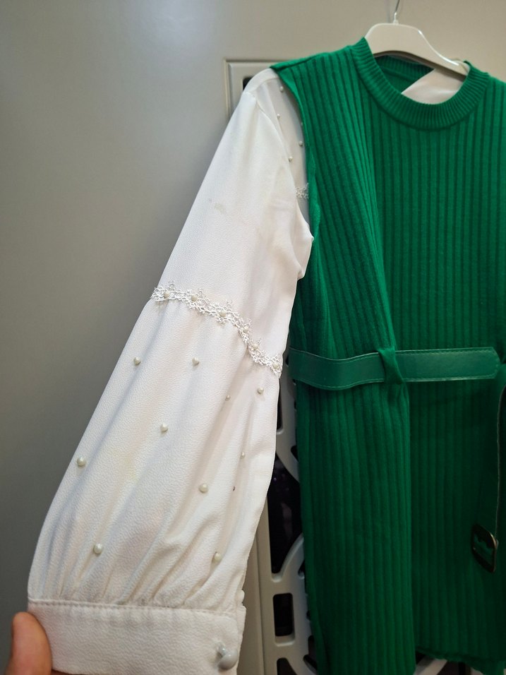 İnci işlemeli uzun kollu beyaz içlik bluzu, balıkçı yaka ve regular fit yeşil kemerli triko kenar yırtmaç detaylı 2 3 defa giydim