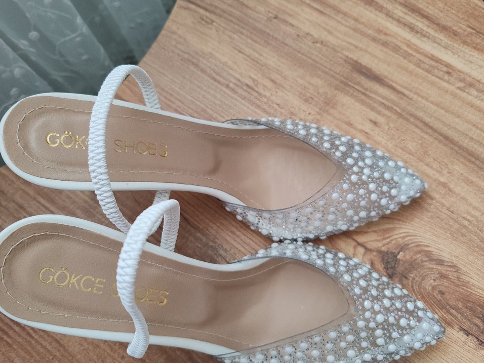 Cam malzemeden, inci işlemeli ve nakışlı beyaz topuklu abiye ayakkabı. Düğünler için modern klasik ve parlak şıklık sunar. Sadece nikahımda 1 kez giydim. Fotoğraflarda görüldüğü üzere hiç bir sorunu yok. Topuk boyu 8 cm
