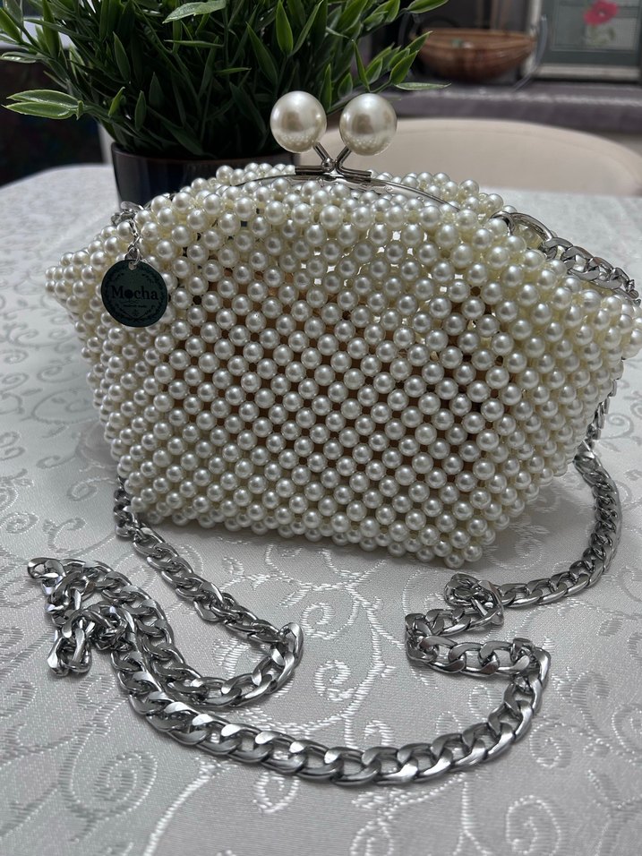 Krem akrilik boncuklarla örülmüş el emeği bu ürün inci boncuk ve metal bursla süslenmiş harika bir kadın çantası. Gümüş zincir askı ve inci detaylı kapanışa sahip çanta, klasik ve modern Paris tarzını yansıtıyor. ✨