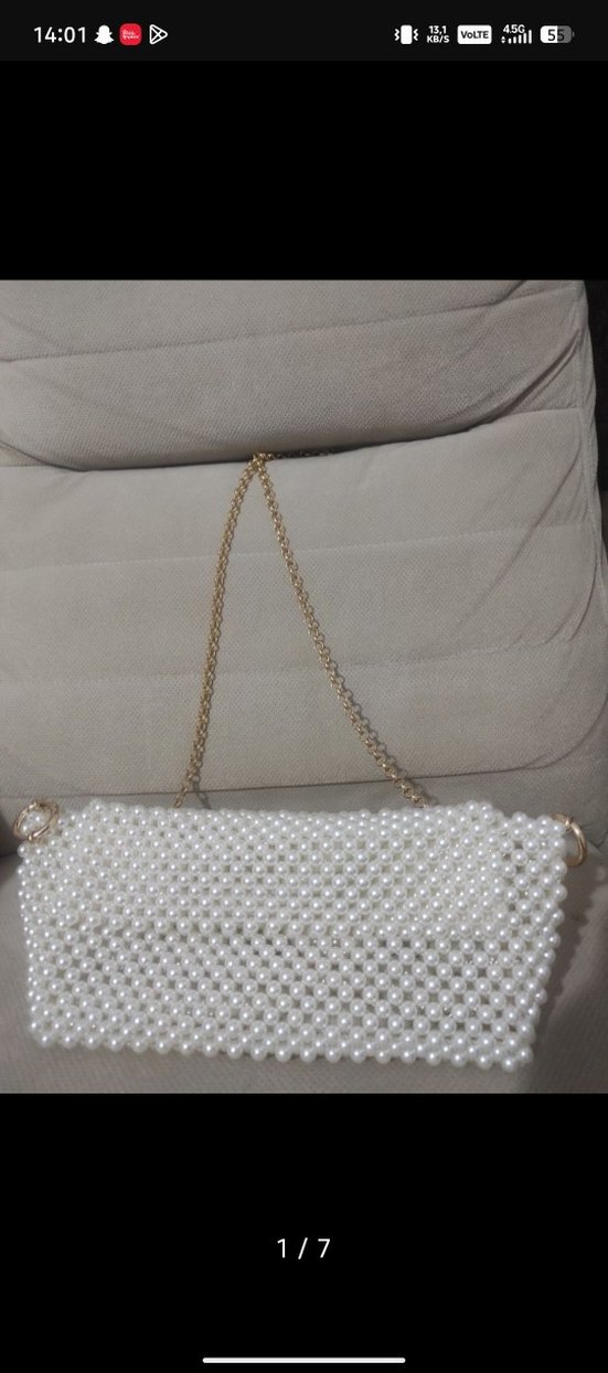 8mm krem inci ile örüldü. uzunluğu 20 inci yüksekliği 10 inci genişliği 6 incidir içine cüzdan telefon gibi bir çok ürün sığar. küçük inciyle ördüğüm için aralıkları çok küçük astara gerek duymazsınız .kendim yaptım. çok geniş bir çanta