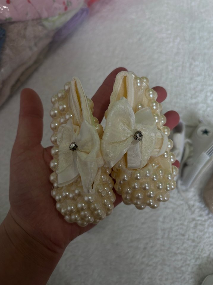 İşlemeli desenlere ve inci boncuk detaylara sahip beyaz örme kız çocuk ayakkabısı, fiyonk ve taş süslemeleri bulunur. Özel günler için uygun.