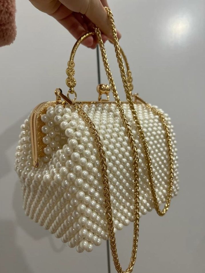 İnci boncuklu, işlemeli beyaz örgü kadın çanta, altın zincir askılı, düğün için uygun şık tasarım.