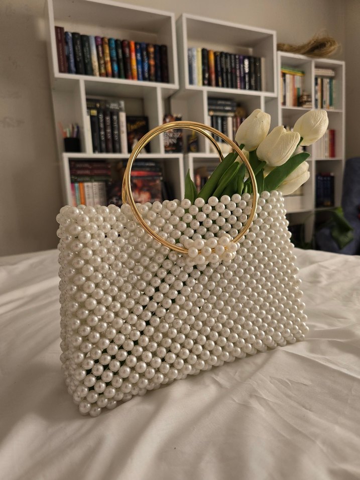 İnci İşlemeli Beyaz Örgü Kadın Çanta