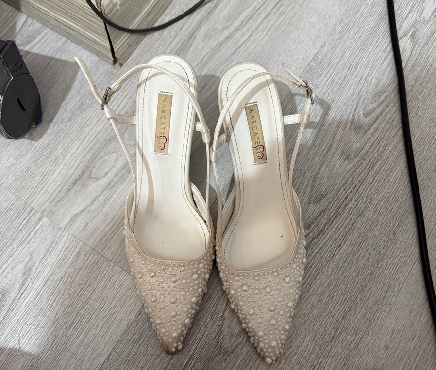 İnci işlemeli beyaz stiletto topuklu, askılı ve çağdaş tasarımlı abiye ayakkabı. Düğünler için uygundur.
