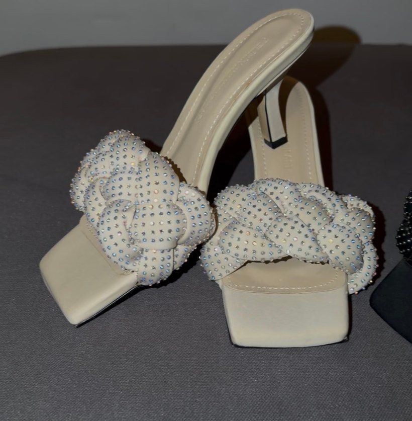 İnci işlemeli ve nakış detaylı beyaz topuklu kadın ayakkabısı. Sentetik kumaştan, düğün ve özel geceler için uygun.