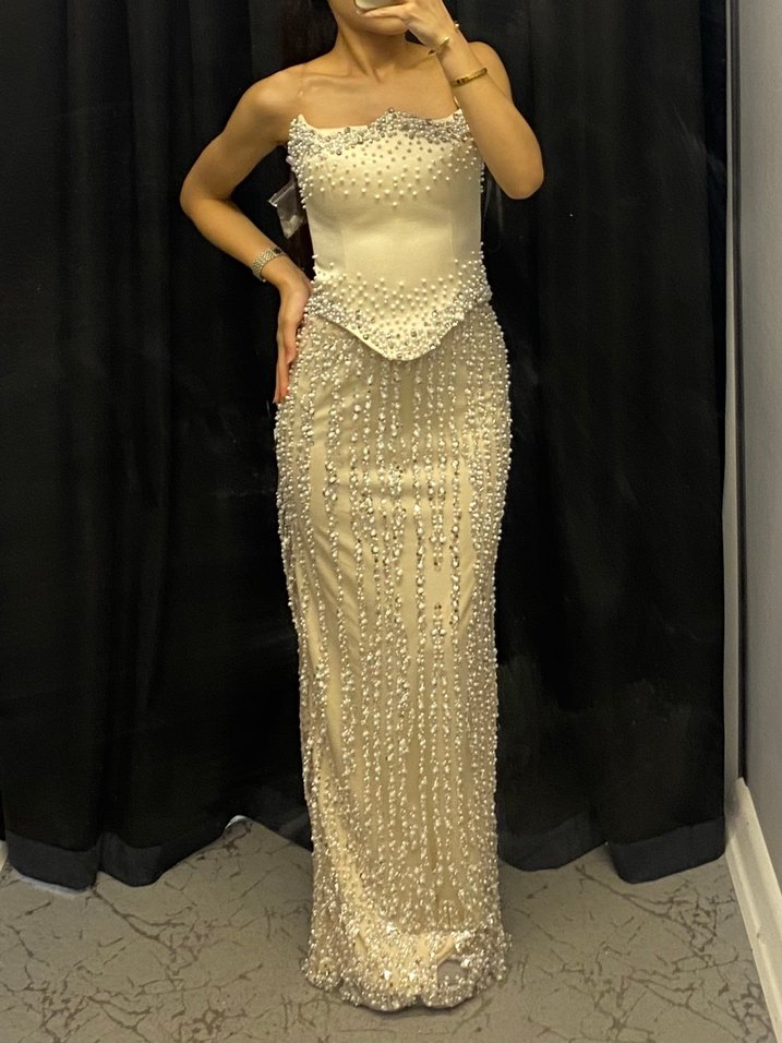 İnci İşlemeli Beyaz Uzun Abiye Elbise