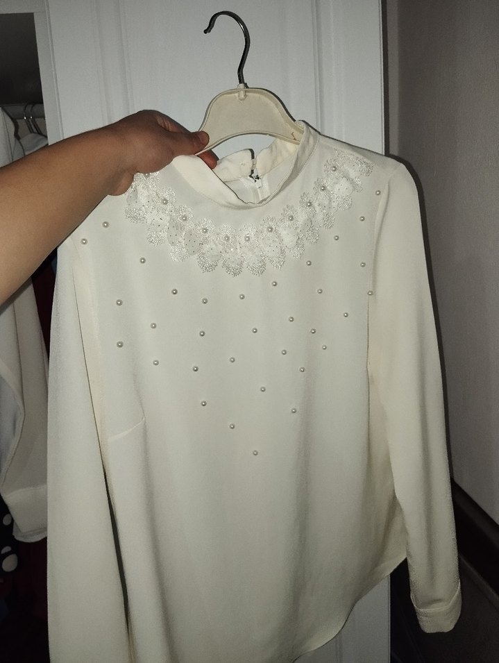 Beyaz, uzun kollu, yuvarlak yakalı, düğmeli ve ince işlemeli inci detaylı, ipeksi kumaştan, bol kesim gömlek. Düğünler için uygundur.