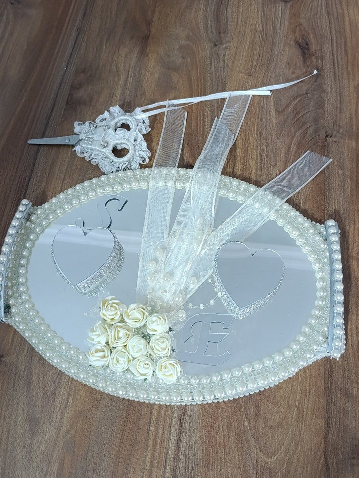 İnci işlemeli beyaz vintage düğün tepsisi, şeffaf kurdeleler ve beyaz güllerle klasik zarafeti yansıtıyor. Dekoratif makasla tamamlanmıştır. tepsiye yansıyan çizgiler tavanın kenarlarıdır.