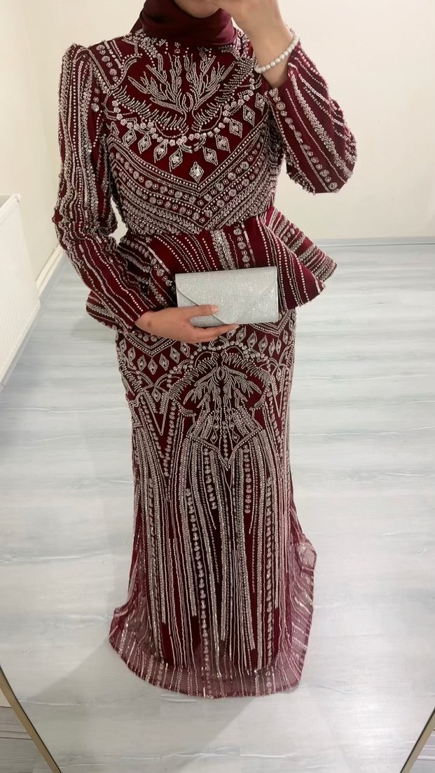 Bordo uzun kollu, V yakalı, inci işlemeli ve desenli abiye elbise. Parlak ve bohem tarzıyla düğünler için uygundur.