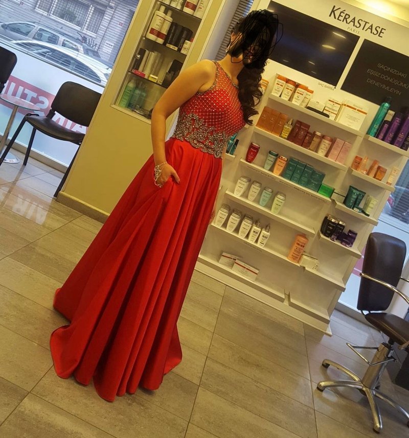 İnci işlemeli, straplez, uzun ve kırmızı parlak kumaştan yapılmış, desenli ve vücuda oturan abiye elbise. Düğünler için uygundur, kolsuz ve modern tarzda. ✨ kına gecemde giydim bikere giyildi severek giydim çok güzel bir elbise iki parçadan oluşuyor Fatih’ten alınmıştı