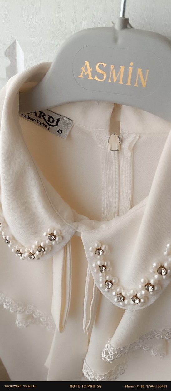 İnci ve boncuk işlemeli yakasıyla krem, fitted kesim kadın gömlek. İpeksi kumaştan, uzun kollu ve düğmeli, modern klasik Paris tarzı, ofis için uygun. ✨2 defa giyildi tertemiz deforme yok