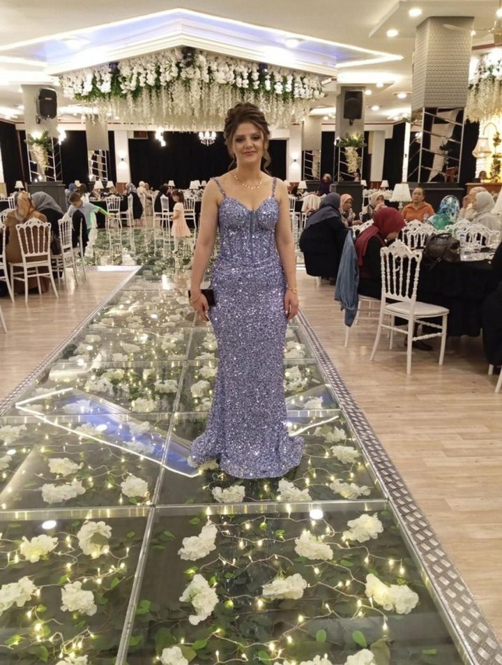 Bu açık mor, v yaka ve askılı, inci işlemeli uzun abiye elbise, bohem desenlerle klasik şıklığı yansıtıyor. ✨