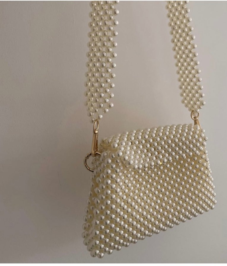 İnci boncuklarla işlenmiş beyaz örgü kadın çanta, bohem stil ve klasik zarafeti bir araya getirir. Günlük kullanım için uygundur.