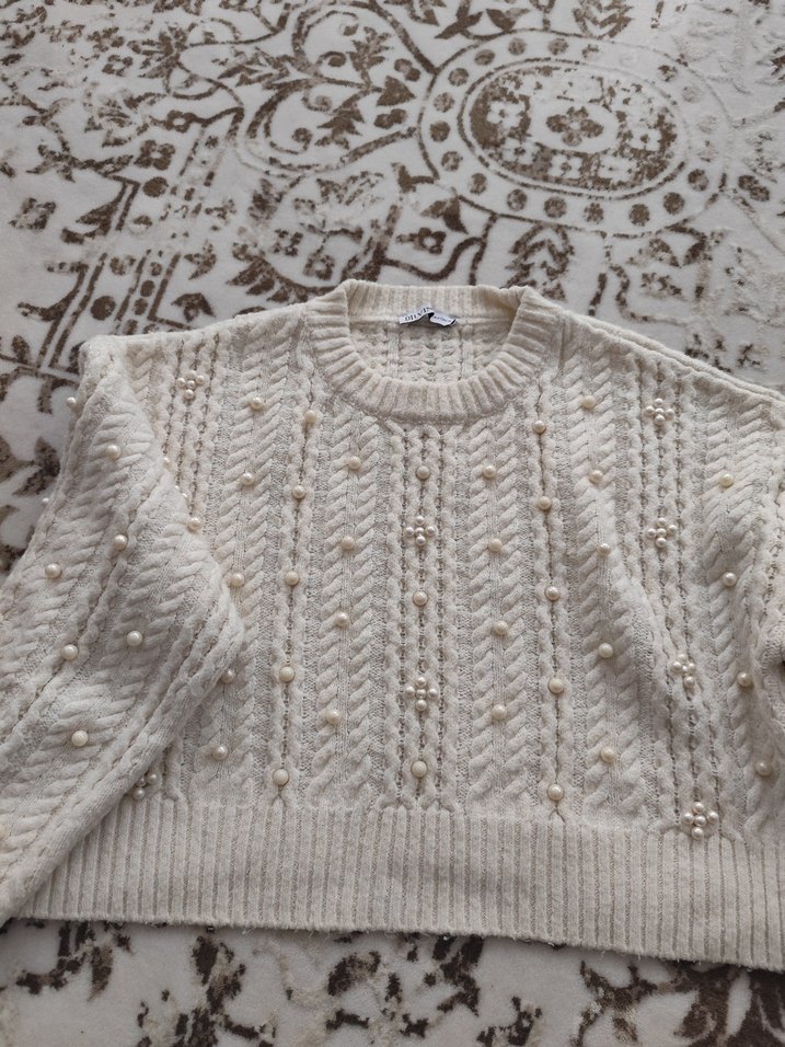 Yuvarlak yaka, uzun kollu, gevşek kesim örgü kazak. İnci işlemeleriyle bohem ve rahat bir tarz sunar. Günlük kullanım için uygundur.