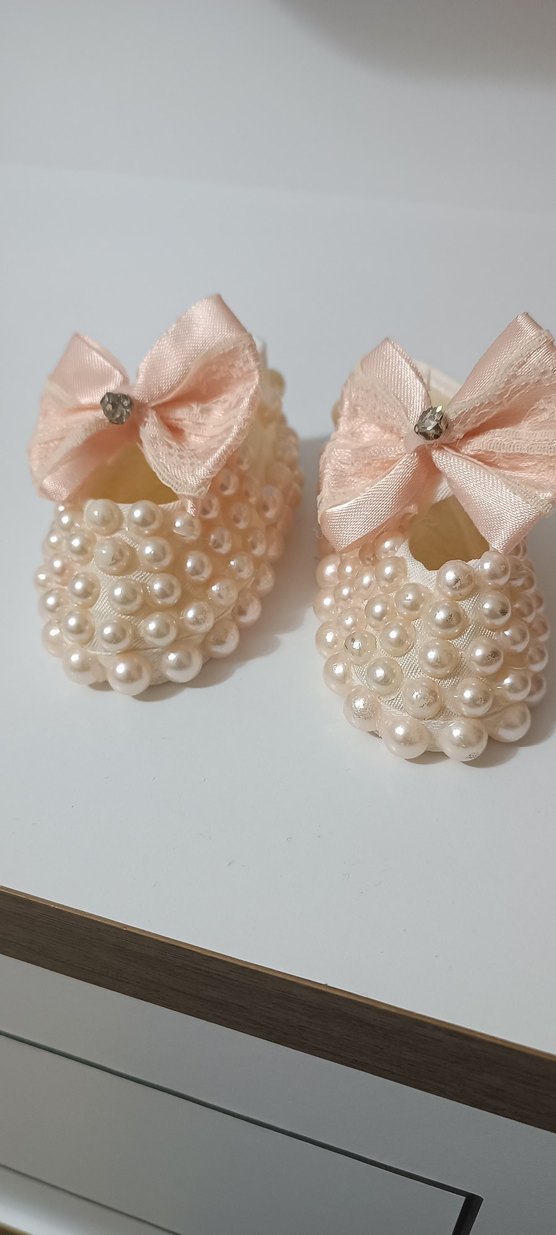 Pastel pembe renkli, örme kumaştan yapılmış kız çocuk ayakkabıları, inci işlemeli ve saten fiyonk detaylıdır. Klasik ve zarif bir tasarıma sahiptir.