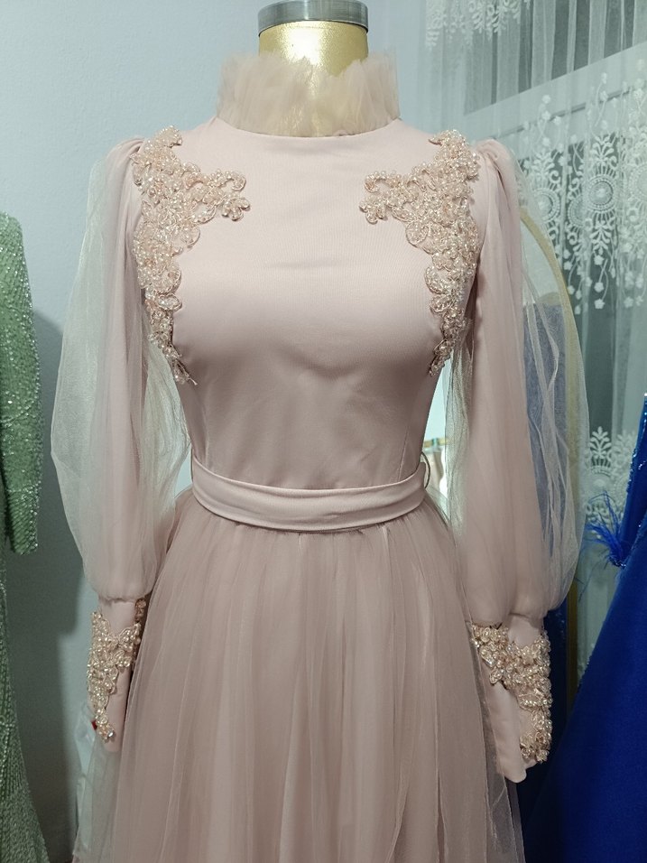 İnci İşlemeli pudra Uzun Abiye Elbise