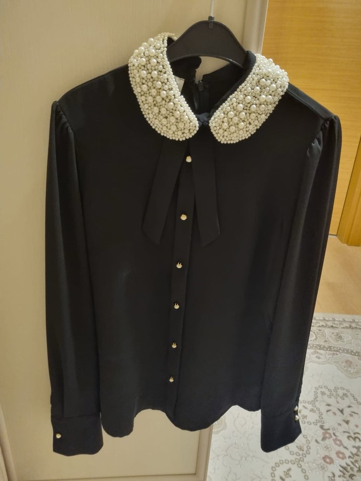 İnci işlemeli yakası ve düğmeli önü olan, ipeksi dokulu siyah uzun kollu gömlek, klasik zarafetle gotik tarzı ofis kullanımı için birleştirir. Setrems marka