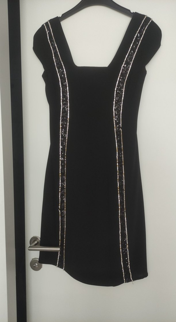 İnci işlemeli, tek renk siyah midi elbise, ince kesim ve kayık yaka tasarımıyla ofis için uygundur. ✨