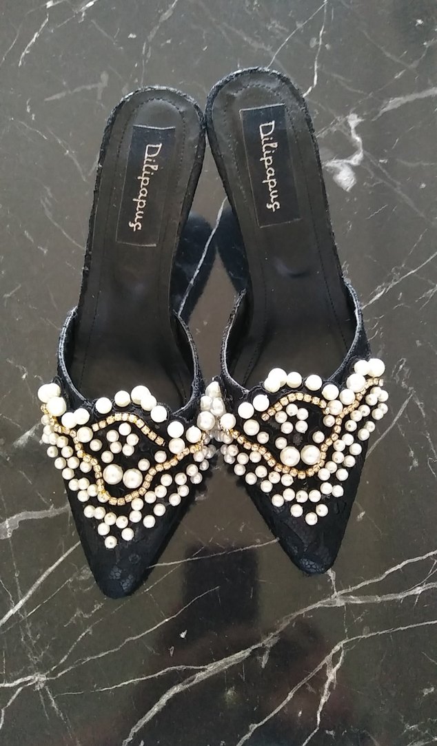 İnci işlemeli, işlemeli siyah stiletto topuklu ayakkabı. Lastik malzemeden yapılmış, düğünler için uygun şık gotik tarz. Marka: Dilipapus.