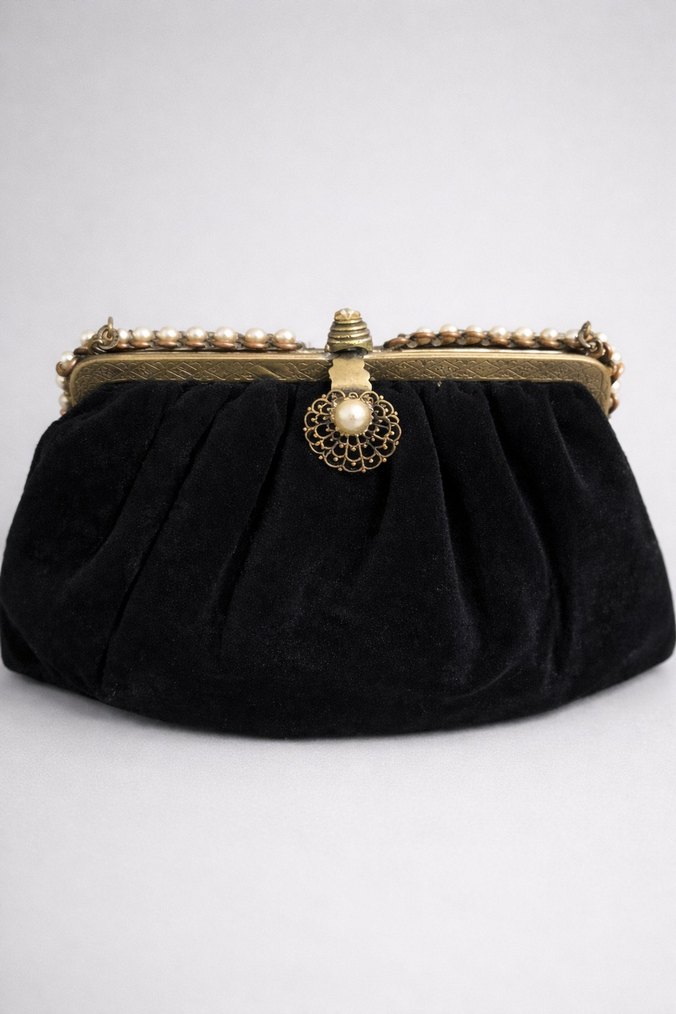 Siyah süet kumaştan yapılmış, işlemeli ve boncuk detaylı vintage tarzda, inci süslemeli tokasıyla düğün için uygun kadın clutch çanta.