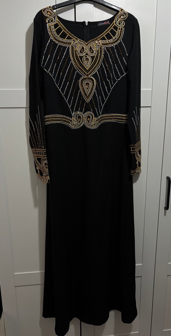 Siyah uzun elbise, V yaka ve uzun kolludur. İşlemeli ve boncuk detaylıdır. Düzenli kesimiyle mütevazı ve gotik tarz için uygundur, düğünler için ideal.